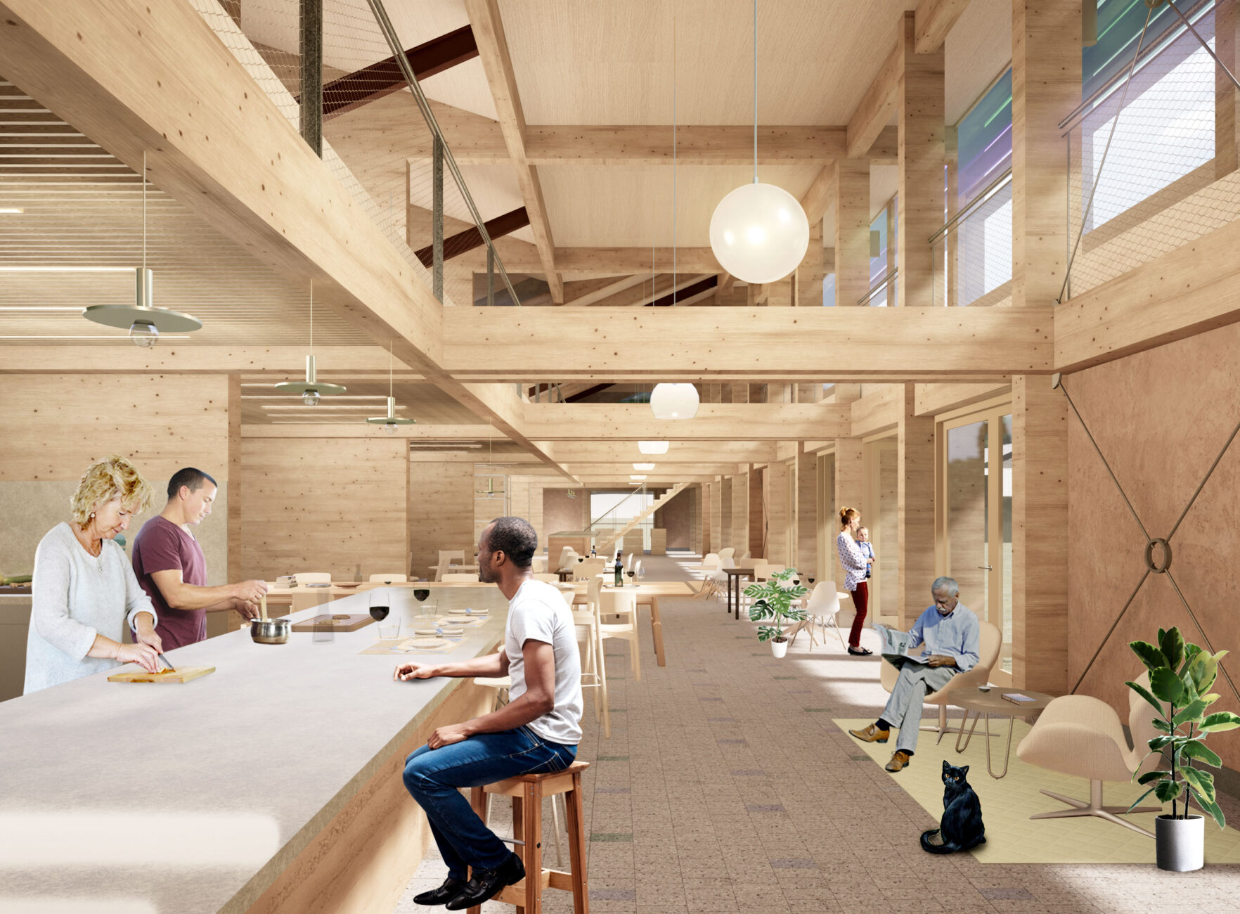 De volledige hoofddraagconstructie is van hout met CLT vloeren en wanden en gelamineerde liggers en kolommen.