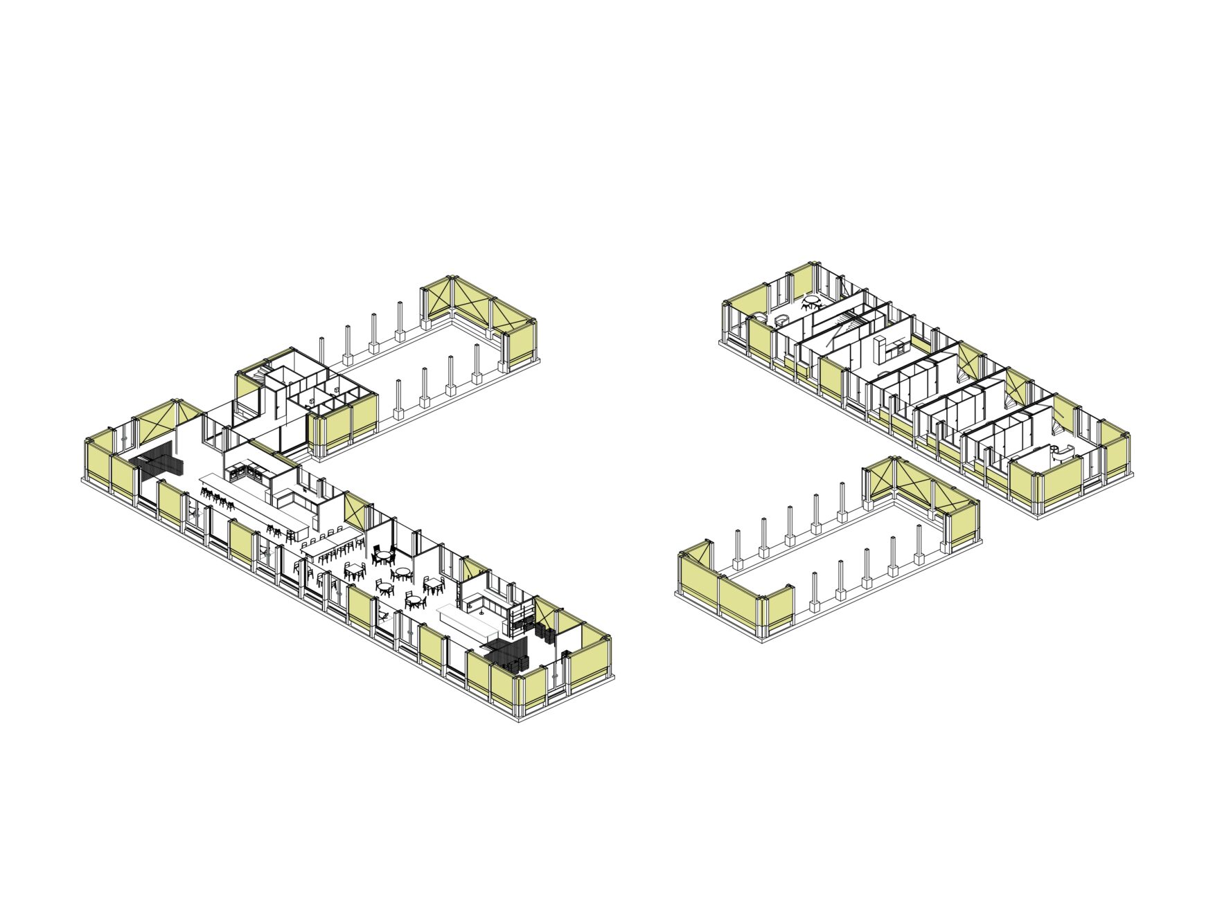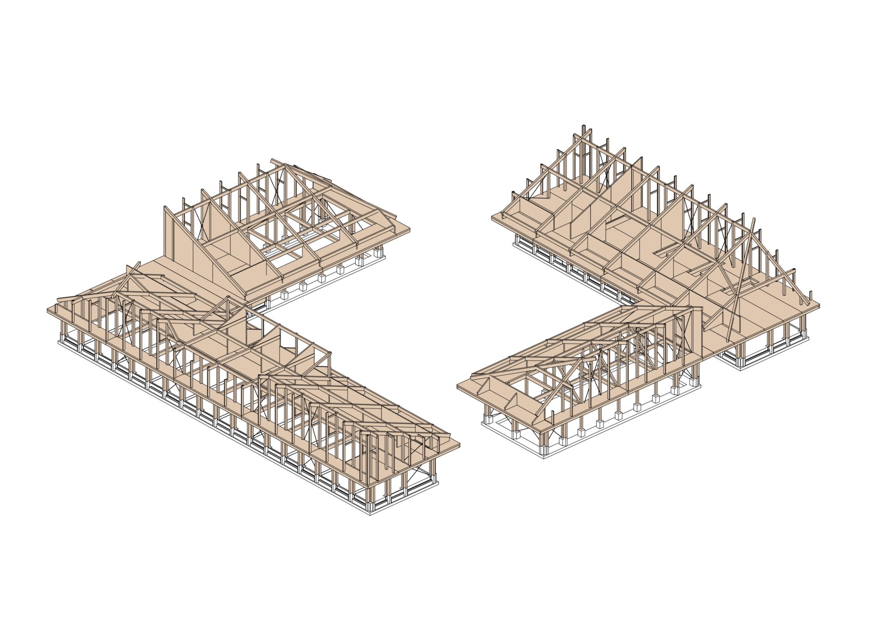 Toepassing hout in dit projectDe volledige constructie is opgebouwd van massief houten vloeren en wanden, en houten liggers en kolommen. - Materiaal
