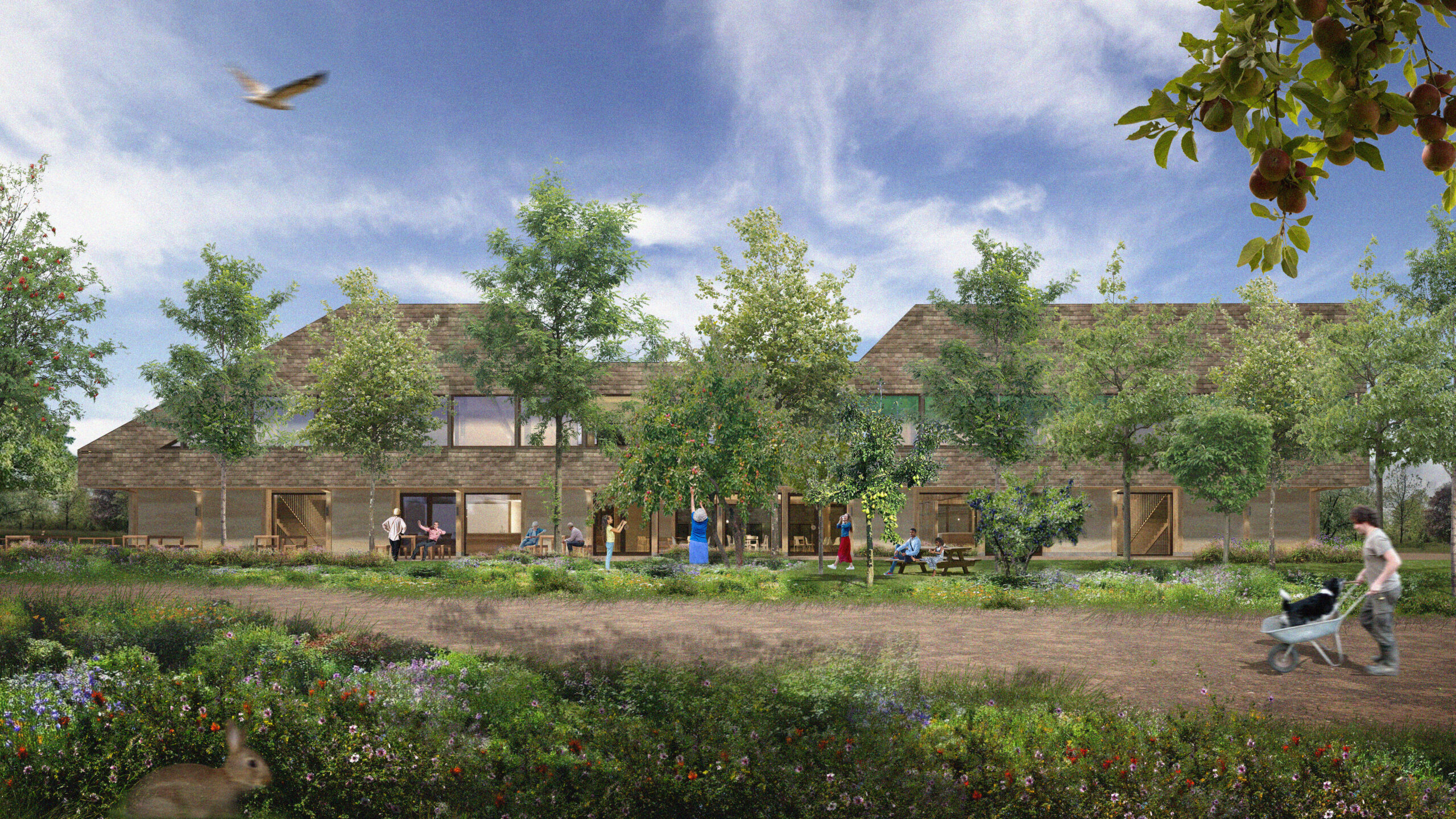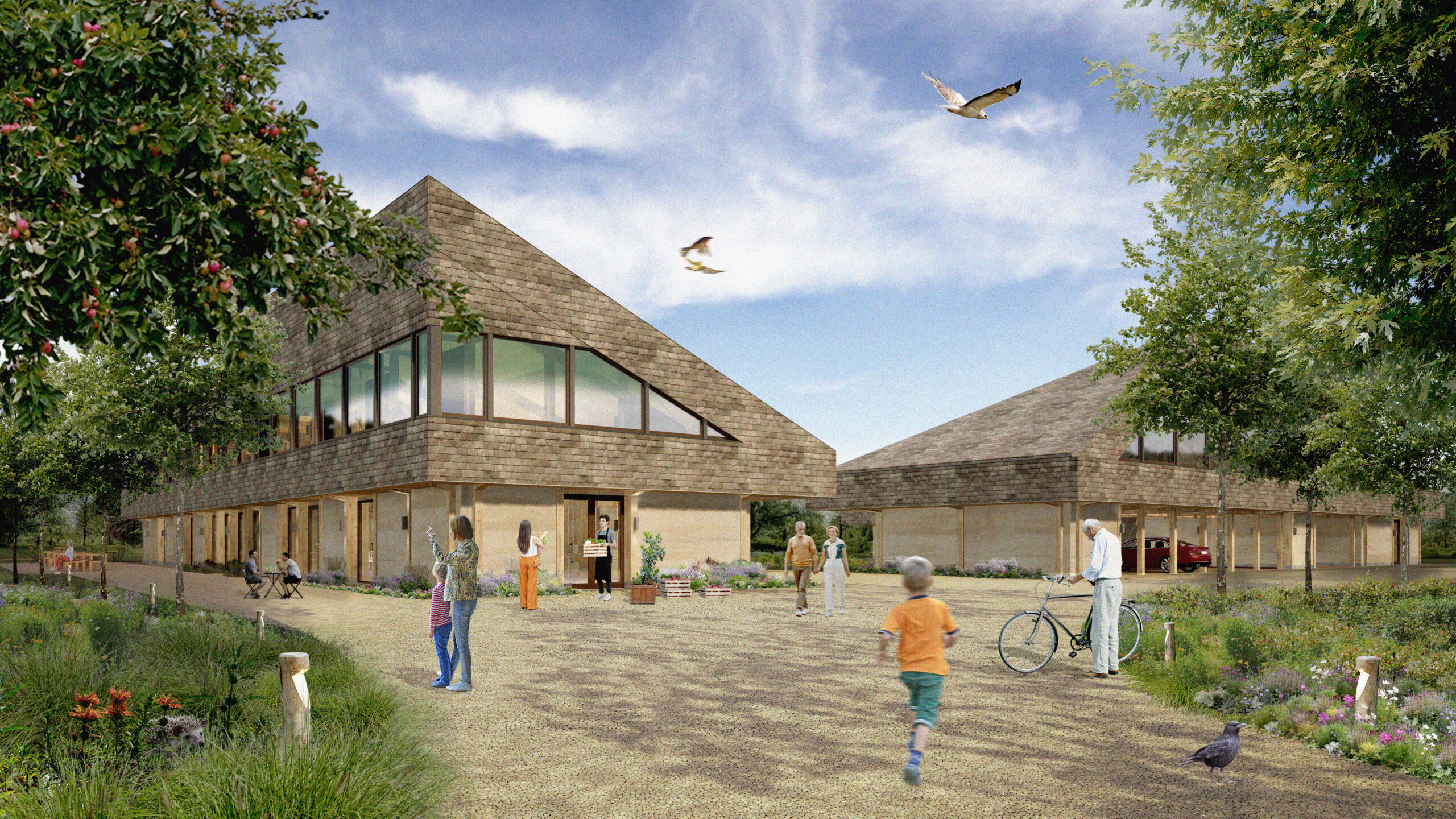 Op de plek waar ooit een veehouderij stond, verrijst een levendig voedselbos van maar liefst 20 hectare. Midden in dit groene paradijs komt een multifunctionele hoeve die ruimte biedt aan woningen, gastenverblijven, een sfeervolle lunchroom en een landwinkel vol lokale producten. Gebouwd met circulaire technieken en bio-based materialen, vormt de hoeve een harmonieus samenspel met het landschap – een bron van inspiratie voor duurzaam wonen, werken en samenleven in balans met de natuur.